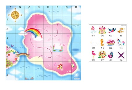 Pour les princesses aventureuses ! Carte au trésor et feuille d’autocollants avec 12 autocollants de conte de fées. Créez votre propre carte au trésor et collez les autocollants de conte de fées correspondants dans la bonne case.