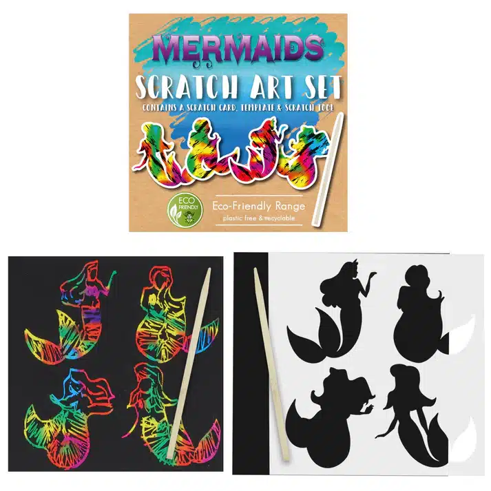Joli mini kit de grattage sur le thème des sirènes. Chaque kit comprend un pochoir avec 4 sirènes, une carte à gratter et un grattoir en bambou. Grattez et découvrez la magie !