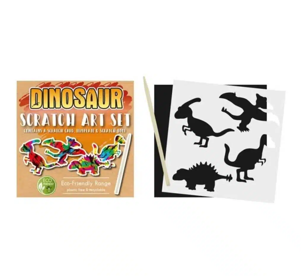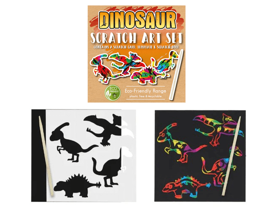 Leuk mini krassetje in dinosaurus-thema. Elk setje bestaat uit een sjabloon met 4 dino’s, een kraskaart en een bamboe krasstokje.